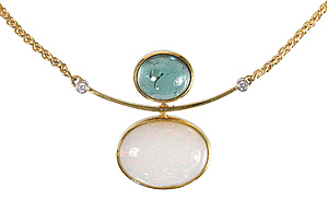 Necklace with decorative middle section, GG 585/000, central opal (Australia) approx. 7.5.0 ct (17.0 x 13.0 mm), lively play of colors in predominantly red hues, tourmaline cabochon approx. 4.3 ct (10.2 x 8.8 mm), 2 brilliant-cut diamonds 0.06 ct, w-si, cable chain with lobster clasp, L = approx. 45.0 cm, opal with drying crack), total 14.6 g