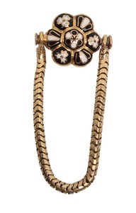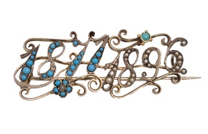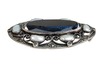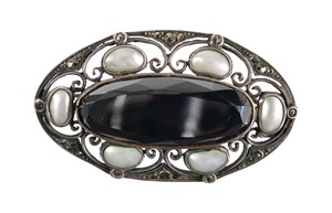 Brosche, THEODOR FAHRNER Pforzheim Anfang 1920er Jahre, SILBER 830/000, sig TF, zentral facettierter Onyx, im Kranz Naturperlen (Schalen), durchbrochen gearbeitete Bögen mit Markasiten besetzt, ca. 45,3 x 26,8 mm, Broschierung teilw. später restauriert. Literatur bei ARNOLDSCHE THEODOR FAHRNER (ähnliche)