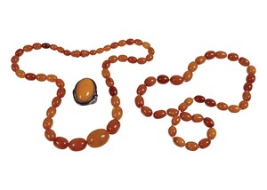 Lot: 2 necklaces, 1 ring, amber BUTTERSCOTCH, 1 ring, SILVER 925/000, RW approx. 50; 1 necklace, olives approx. 7.2-14.0 mm, L = 45.0 cm; 1 necklace, olives approx. 7.3-10.0 mm, L = 43.0 cm, both with swivel clasp, total 38.7 g