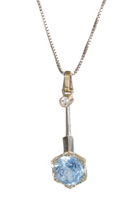 Pendant, ART-DECO 1930/40s, GG/WG 585/000, in the suspended pendant 1 white stone (faceted), below a hexagonally set aquamarine-colored synth. spinel approx. 4.70 ct, H = 39.5 mm, chain WG 333/000 L = approx. 40.0 cm, total approx. 4.7 g
