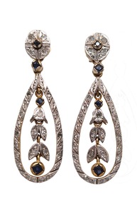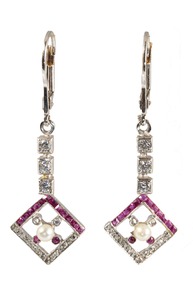 1 Paar Ohrhänger im ART-DECO Stil (mit Klappbügeln), WG 585/000, 6 Brillanten ca. 0,21 ct w/si, im Quadrat eine kl. Perle, farbintensive facettierte Rubine sowie weiße Diamantrosen runden das Bild ab, H = 43,0 mm