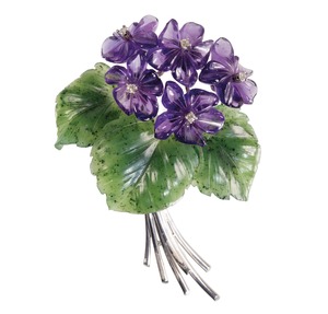 Brooch, FLOWERS with LEAVES, IDAR OBERSTEIN mid-20th century, wg 750/000, signed AMU, 5 amethyst flowers (engraved), the flowers set with 5 white diamonds, 3 decorative engraved green leaves (nephrite/jade?), brooch approx. 53.5 x 52.5 mm, total 23.3 g
