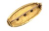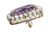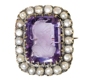 Brooch 1st half 19th century, GG 585/000, amethyst with an INTAGLIO, helmeted male head, wreath with 22 1/2 pearls, approx. 22.5 x 27.2 mm, total 9.4 g