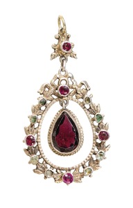 Pendant, SIEBENBÜRGEN mid-19th century, SILVER, central almandine drop (movably suspended), the richly decorated frame containing further faceted garnets, interspersed with light green single-cut stones (emeralds ?), ornaments sculpted on both sides, h = approx. 52.5 mm