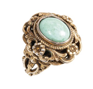 Ring, SIEBENBÜRGEN Mitte 19.Jhd., SILBER, zentraler Türkiscabochon, reich verzierter Ringkopf u. Seitenteile, Ornamente plastisch ausgearbeitet, Ringkopf ca. 19,9 x 21,5 mm, RW ca. 53,5