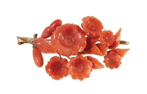 Brooch, circa 1850, GG 585/000, 6 cut/engraved coral blossoms, sculpted, some buds and leaves round off the piece of jewelry, branch finely structured, approx. 59.5 x 33.5 mm, total 11.6 g