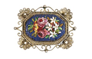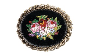 Brooch, circa 1860/70, MIKROMOSAIK, silver-plated tombac, bouquet of flowers surrounded by a wreath of leaves, approx. 48.7 x 41.5 mm
