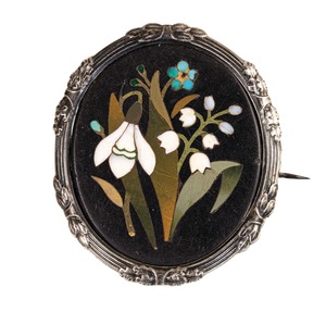Brosche, PIETRA DURA um 1850, SILBER 800/000, Maiglöckchen u. Veilchen, Blüten in Koralle u. Türkisen eingelegt, Zierrahmen, ca. 42,2 x 48,5 mm