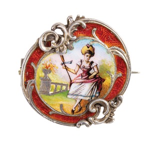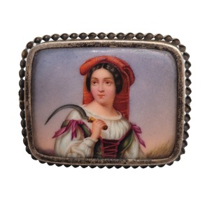 Brosche Mitte 19.Jhd., SILBER 800/000, Emaillemalerei mit einer galanten Parkszene (Watteauszene), ca. 25,2 x 26,0 mm
