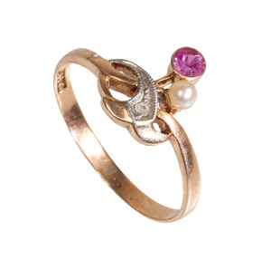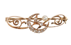 Brooch, late 19th century, ROSÈ-GOLD 585/000 (original hallmark very indistinct, later laterally re-punched!), small contemporary pearl, in the crescent are 11 very high cut old-cut diamonds white with beautiful fire (middle stone approx. 0.10 ct), in the leaves 4 further old-cut diamonds white, approx. 38.3 x 13.0 mm