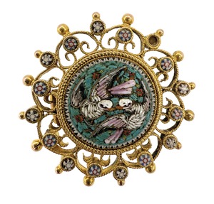 Brosche Mitte 19 Jhd., GG 585/000, signiert G, feines MIKROMOSAIK mit 2 Vögeln (Tauben), im Kranz Venezianische Glasblüten, auf den hochkant gestellten Draht sind feinste kordierte Drähte aufgelötet, D = ca. 29,5 mm