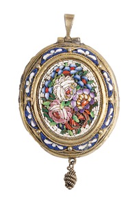 Mosaic brooch 1st half 19th century, SILVER-gilt, bouquet of flowers in a white-blue frame, can also be worn as a pendant, approx. 31.5 x 49.2 mm