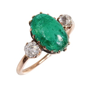 Ring 2.Hälfte 19.Jhd., GG 585/000, farbintensiver Smaragdcabochon ca. 2,9-3,0 ct (ca. 11,3 x 7,45 mm mit Tragespuren), seitlich 2 Altschliff-Diamanten ca. 0,55 ct in einem schönen weiß mit lebhaftem Feuer, RW ca. 52