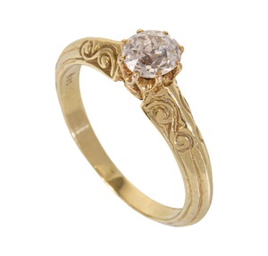 Solitaire ring 1st half 19th century, GG 585/000, 1 old-cut diamond approx. 0.73 ct, slightly tinted with inclusions, small naturals on the rondiste, ring head with beautiful ornament on both sides, lines drawn far down, RW approx. 56