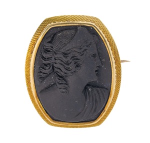 Brooch, Idar-Oberstein, circa 1830/50, GG 585/000, cut agate gem with portrait of a woman to the right, beautifully crafted, approx. 25.0 x 30.3 mm, with box !