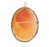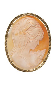 Brosche (auch als Anhänger zu Tragen), GG 750/000, gravierte Muschelgemme, Damenportrait nach links, geprägter Rand, ca. 38,0 x 49,2 mm, total ca. 9,5 g