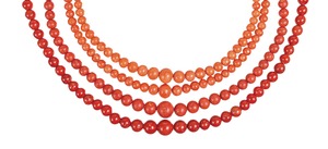 Lot: 3 gradient coral necklaces, 1 necklace (light, double with silver clasp), l = 40.5 cm (inside), total 27.0 g; 1 necklace, d = 4.8-9.0 mm, l = 48.0 cm; 1 necklace, d = 4.3-9.4 mm, l = 42.0 cm, both total 44.2 g (with metal clasps)