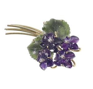 Brosche, GG 585/000, geschnittene Amethystblüten mit Diamanten besetzt (weiß), gravierte Nephrit/Jadeit Blätter, ca. 49,5 x 31,0 mm, total 10,1 g