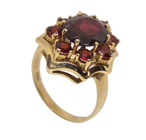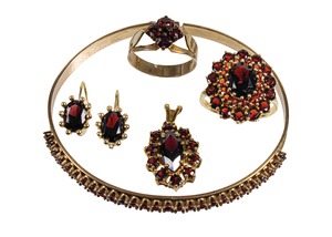 Lot of garnet jewelry: GG 333/000, 1 bangle (top set with stones, inside: 60.0 x 53.0 mm; 1 ring, ring head approx. 17.6 x 19.3 mm, RW approx. 55.5; 1 ring RW 51.5; 1 pendant, H = 26.0 mm and 1 pair of drop earrings, H = 17.4 mm, total 18.2 g