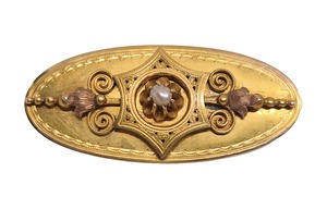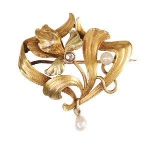 Brosche Ende 19.Jhd., ROSÈ-GOLD 585/000 (Originalpunze sehr undeutlich, später seitlich nachpunziert!), kleine zeitgemäße Perle, im Halbmond sitzen 11 sehr hoch geschliffene Altschliff Diamanten weiß mit schönem Feuer (mittlerer Stein ca. 0,10 ct), in den Blättern 4 weitere Altschliff-Diamanten weiß, ca. 38,3 x 13,0 mm