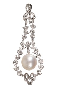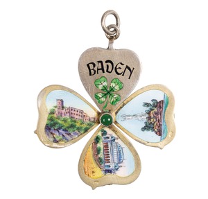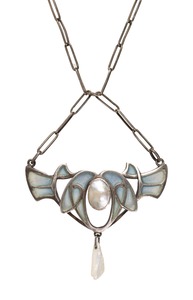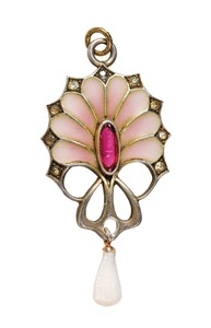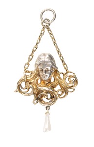 Pendant, SIEBENBÜRGEN mid-19th century, SILVER 800/000, a green stone in the center, the floral surface set with 1 garnet, and three pearl shells, a movably suspended natural pearl at the bottom, h = approx. 60.0 mm
