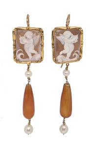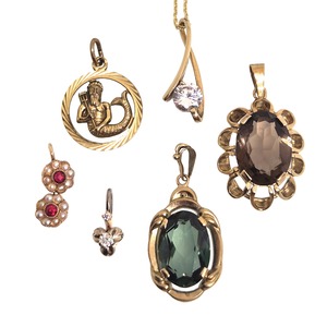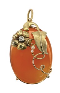 Pendant 1940s, GG 585/000, carnelian with floral decoration, small old-cut white diamond, h = 49.0 mm, total 8.9 g