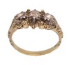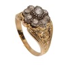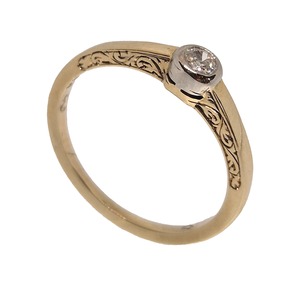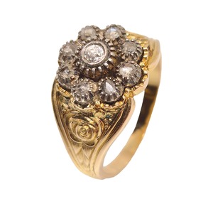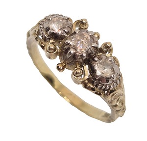 Solitär-Ring 1.Hälfte 19.Jhd., GG 585/000, 1 Altschliff-Diamant ca. 0,73 ct, leicht getönt mit Einschlüssen, an der Rondiste kleine Naturals, Ringkopf beidseitig mit schönem Ornament, Linien weit nach unten gezogen, RW ca. 56