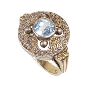 Ring, SIEBENBÜRGEN mid 19th century, SILVER, central turquoise cabochon, richly decorated ring head and side parts, ornaments plastically worked, ring head approx. 19.9 x 21.5 mm, RW approx. 53.5