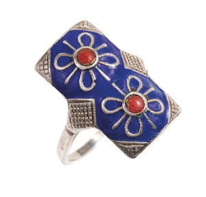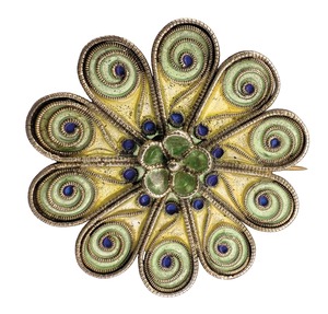 Brooch in JEWISH STYLE, Egyptian style, SILVER 925/000, stylized papyrus flowers, turquoise and blue enamel, approx. 42.8 x 44.6 mm