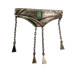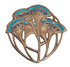 Brosche im JUGENDSTIL, ägyptisierend, SILBER 925/000, stilisierte Papyrusblüten, türkisfarbenes u. blaues Emaille, ca. 42,8 x 44,6 mm