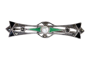 Pin, ART-DECO 1930/40s, SILVER 830/000, black enamel with green accents, a pearl in the center, marcasites, L = 40.6 mm
