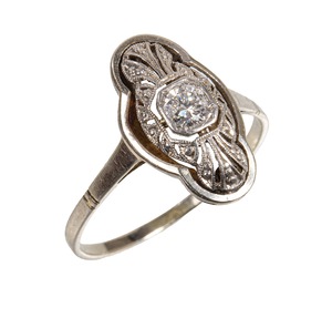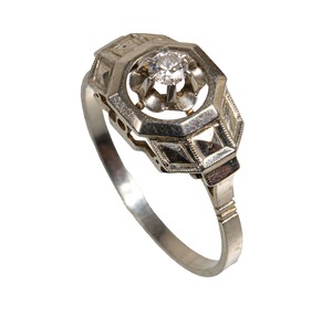 Ring, ART-DECO, Frankreich 1930/40er Jahre, WG 750/000, zentraler Brillant ca. 0,10 ct tw/w-vsi, RW ca. 54