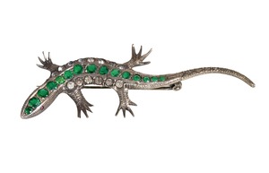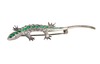 SALAMANDER brooch, ART-DECO 1930s/40s, SILVER 830/000, green rhinestones across the back, colorless rhinestones on the sides, 2 small red stones in the eyes, l = approx. 73.5 mm
