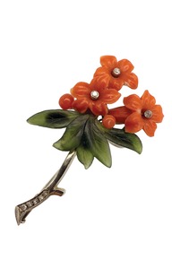 Zarte Brosche, Österreich 1920/30er Jahre, WG 585/000, 3 fein geschnittene Korallenblüten besetzt mit 3 Diamanten, zarte Nepprit/Jadeit Blätter, im Stil 5 weitere Altschliff Diamanten, L = 47,0 mm