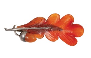 Brooch ART-DECO circa 1930, SILVER 800/000, cut carnelian in the shape of an acorn leaf, as acorn amber BUTTERSCOTCH, brooch approx. 70.7 x 30.7 mm