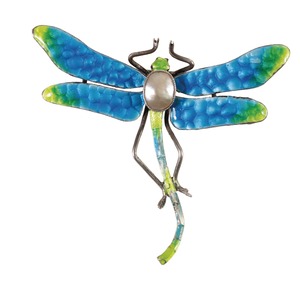 Brosche, ART-DECO 1930/40er Jahre, SILBER 800/000, farbenfroh emaillierte LIEBELLE, zentral eine Muschelperle, rückseitig ebenso transluzid emailliert, ca. 50,8 x 44,5 mm