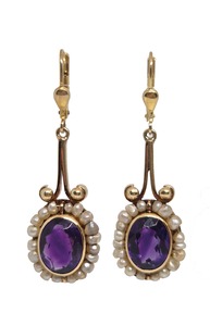 Ohrhänger im Victorian-Stil um 1920, (Klappbügel später, GG 585/000, abgehängter Amethyst total ca. 4,6 ct, Perlkranz (wohl Naturperlen), H = ca. 43,0 mm