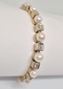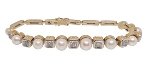 Armband, ART-DECO ca. 1940er Jahre, GG 585/000, 9 Akoja-Perlen, mittlere Perle: D = 9,0 mm, 8 Brillanten ca. 0,72 ct w-vsi (weiß gefasst), Fassungen u. Band seitlich graviert, integriertes Kastenschloss mit 2 Sicherheitsachten, L = 18,3 cm, total 24 g