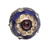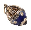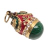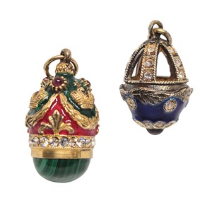 Lot: Russian charms, EGGS as pendants, 1 egg, SILVER 925/000-gilt (hallmarked with hammer and sickle), cobalt blue enamel with colorless rhinestones, garnet-colored cab. in the tip; 1 egg, gilt, with red and green enamel and colorless rhinestones, finished with a malachite, h = 30.0 - 31.2 mm