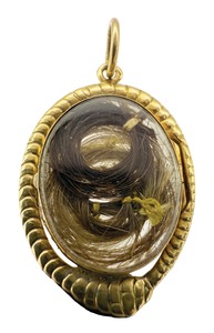 Anhänger/Medaillon, Frankreich 1.Hälfte 19.Jhd., GG 750/000 (Adlerkopf mit Gegenpunze), beidseitig mit Bergkristall/Glas gefasst, den Rahmen ziert eine stilisierte Schlange, zarte Reste von schwarzem Emaille, H = 32,3 mm, total 2,8 g