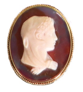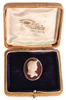 Brosche, Idar-Oberstein um 1830/50, GG 585/000, geschnittene Achatgemme mit Frauenportrait nach rechts, plastisch schön ausgearbeitet, ca. 25,0 x 30,3 mm, mit Schatulle !