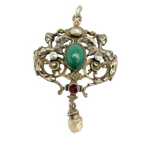 Anhänger, SIEBENBÜRGEN Mitte 19.Jhd., SILBER 800/000, mittig ein grüner Stein, in der floral gestalteten Oberfläche sitzen 1 Granat, und drei Perlschalen, unten eine beweglich abgehängte Naturperle, H = ca. 60,0 mm