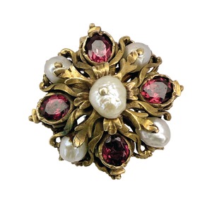 Rosette-shaped brooch/pendant, SIEBENBÜRGEN mid-19th century, SILVER-gilt, 5 natural pearls crosswise, 4 faceted almandine garnets in the florally designed surface, d = approx. 25.0 mm