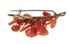 Brosche um 1850, GG 585/000, 6 geschnittene/gravierte Korallenblüten, plastisch ausgearbeitet, einige Knospen u. Blätter runden das Schmuckstück ab, Ast fein struktuiert, ca. 59,5 x 33,5 mm, total 11,6 g