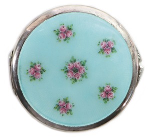 Puderdose, ART-DECO 1930/40er Jahre, SILBER 925/000, transluziedes Emaille mit Rosenblüten, guillochiert, D = 79,7 mm, total 113,6 g, ungebraucht !!
