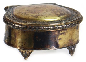 Spice salver, AUGSBURG c. 1750/80, SILVER, gilt interior, exterior with age-appropriate patina, stamped horseshoe shape, rim of the hinged lid with punched border, 4 small ornamented feet, compartment divided inside, dimensions: 64.2 x 51.5 x 35.5 mm, total 81.4 g