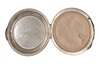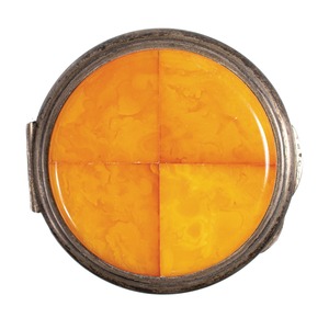 Powder box with mirror, WIENER WERKSTÄTTE of the 1930s, SILVER 835/000, signed, WW 835, lid inlaid with amber BUTTERSCOTCH, reverse finely ornamented, d = 81.5 mm, total 110.5 g, unusual make-up utensil !