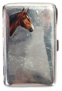 Kleines Zigarettenetui für die Handtasche, SILBER 935/000, signiert V & C°, farbig emaillierter Pferdekopf, innen vergoldet, ca. 49,5 x 77,8 mm, schöner Zustand !