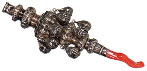 Kinder Rassel, BIEDERMEIER 1.Hälfte 19.Jhd., SILBER, Korpus mit stark reliefiertem Ornament, 14 mit Draht belötete Schellen, an einem Ende eine Pfeife u. am anderen Ende ein dekorativer roter Korallenast, L = 16,8 cm, total 95,0 g, ein schönes Stück aus der Kinderstube !