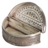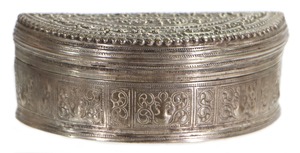 Antique semicircular box, 19th century, SILVER, lid with very finely worked surface, frieze delicately relieved, w = 97.0 mm, h = approx. 4.0 mm, box can also be used as a pendant (amulet) and probably originates from Nepal, total 130 g